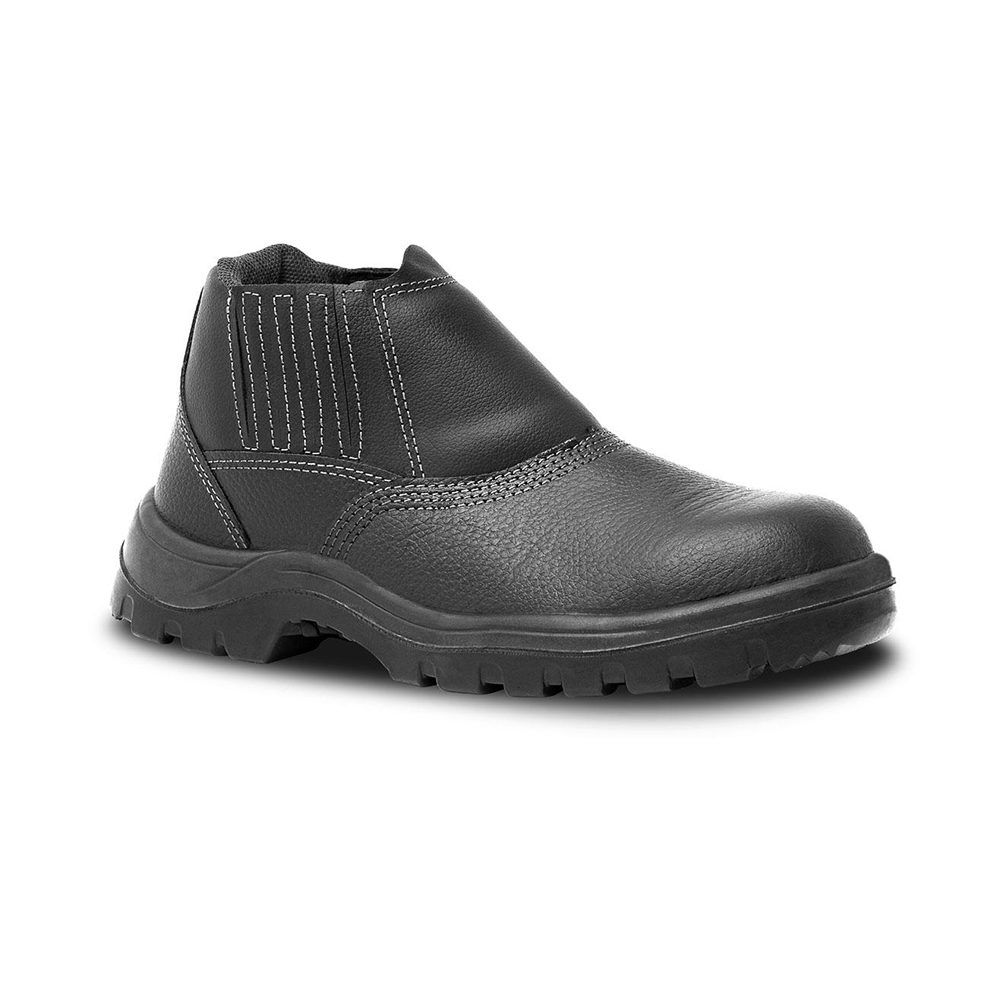 CALÇADO DE SEGURANÇA DE USO PROFISSIONAL TIPO BOTINA, FECHAMENTO EM ELÁSTICO, CONFECCIONADO EM COURO CURTIDO AO CROMO, PALMILHA DE MONTAGEM EM FIBRAS NÃO METÁLICAS RESISTENTE À PERFURAÇÃO MONTADA PELO SISTEMA STROBEL, BIQUEIRA DE COMPOSITE, SOLADO DE POLIURETANO BIDENSIDADE ANTIDERRAPANTE INJETADO DIRETAMENTE NO CABEDAL, SISTEMA DE ABSORÇÃO DE ENERGIA NA REGIÃO DO SALTO, RESISTENTE AO ÓLEO COMBUSTÍVEL, PARA USO ELETRICISTA.