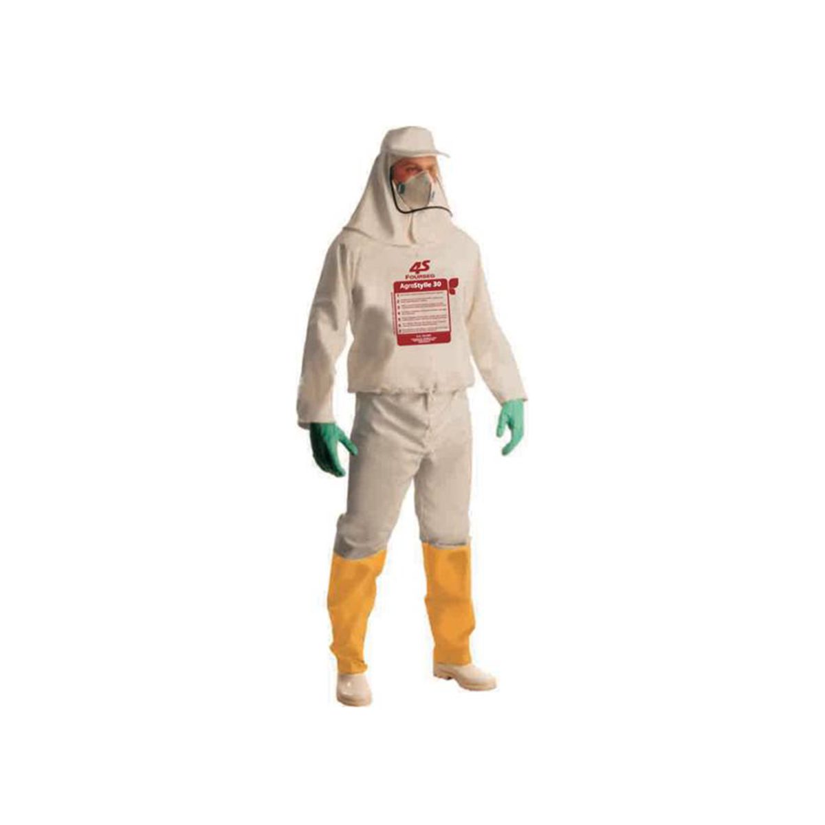 VESTIMENTA DE CORPO INTEIRO, CONFECCIONADA EM TECIDO MISTO HIDRO-REPELENTE. COMPOSTA POR: CAPUZ ISOLADO CONFECCIONADO DO MESMO MATERIAL HIDRO-REPELENTE DAS PEÇAS DA CAMISA E DA CALÇA, COM ABA FRONTAL DE POLIETILENO RÍGIDO REVESTIDO DO MESMO MATERIAL HIDRO-REPELENTE, PALA PARA PROTEÇÃO DO PESCOÇO E DA PARTE SUPERIOR DOS OMBROS CONFECCIONADOS COM O MESMO MATERIAL HIDRO-REPELENTE COM VELCRO NO FECHAMENTO DA ABERTURA FRONTAL EM BAIXO DO QUEIXO; CAMISA COM MANGAS COMPRIDAS E CAVAS RETAS. A GOLA COM VELCRO NA PARTE FRONTAL ABAIXO DO PESCOÇO PARA O FECHAMENTO NA ABERTURA DA GOLA E TIRAS (CORDEL) DE TECIDO NA CINTURA PARA AJUSTES; CALÇA COMPRIDA ATÉ OS PÉS, TIPO RETA, COM ÁREAS DE PROTEÇÃO COM MATERIAL IMPERMEÁVEL OU IMPERMEABILIZADO (PERNEIRA DE PVC) COSTURADO NA PARTE FRONTAL E ATRÁS DAS PERNAS DA CALÇA, COM TECIDO POR BAIXO. NA CINTURA TIRAS DE TECIDO NO CÓS PARA AJUSTES.