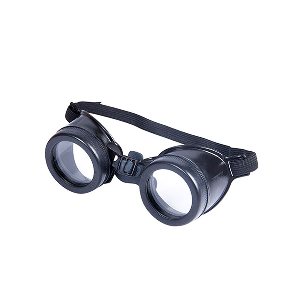 ÓCULOS DE SEGURANÇA CONSTITUÍDOS DE DUAS OCULARES EM FORMATO DE CONCHA UNIDAS POR UMA PONTE DE BORRACHA E TIRANTE ELÁSTICO PARA AJUSTE. AS OCULARES, COM 50 MM DE DIÂMETRO, POSSUEM ANÉIS RETENTORES ROSQUEÁVEIS QUE PERMITEM A FIXAÇÃO DOS FILTROS DE LUZ DE DE MATERIAL PLÁSTICO VERDE (POLICARBONATO VERDE DE TONALIDADE 9) E DAS LENTES DE COBERTURA DE MATERIAL PLÁSTICO INCOLOR (POLICARBONATO INCOLOR).